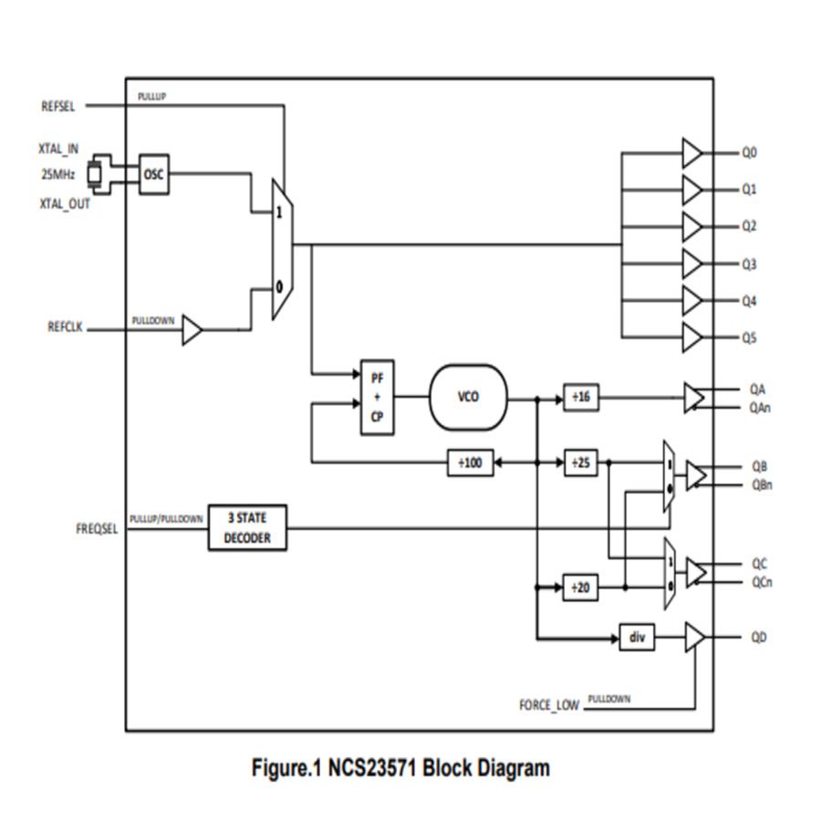 NCS23571 is a clock synthesizer based on PLL. By default, it has 6 LVCMOS outputs buffering the crystal reference clock, 3 differential output pairs providing 100MHz,125MHz, and 156.25MHz and a single-ended LVCMOS output providing 33.33MHz.