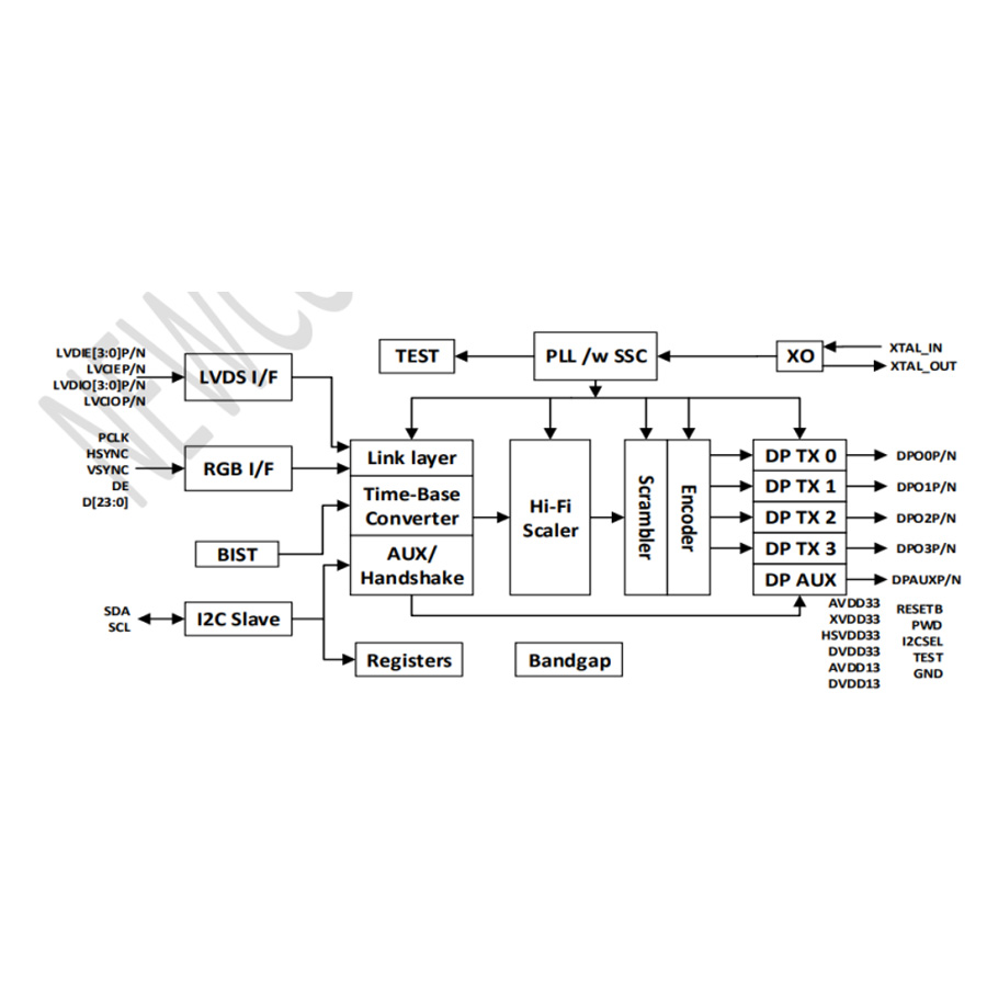 NCS8805 is a low-power RGB/LVDS-to-DisplayPort/eDP converter w/ Scaler, which is designed for mobile devices including smartphones, tablets, laptops, etc. to support highdefinition DP/eDP displays. NCS8805 supports 4-lane DP/eDP output which is typically required to support QXGA (2048*1536) and above at 60Hz frame rate. NCS8805 supports up to UHD(3840*2160). All the functions including both RGB and LVDS interfaces pack into a small 7mm*7mm QFN56 package which saves the precious space in mobile devices.