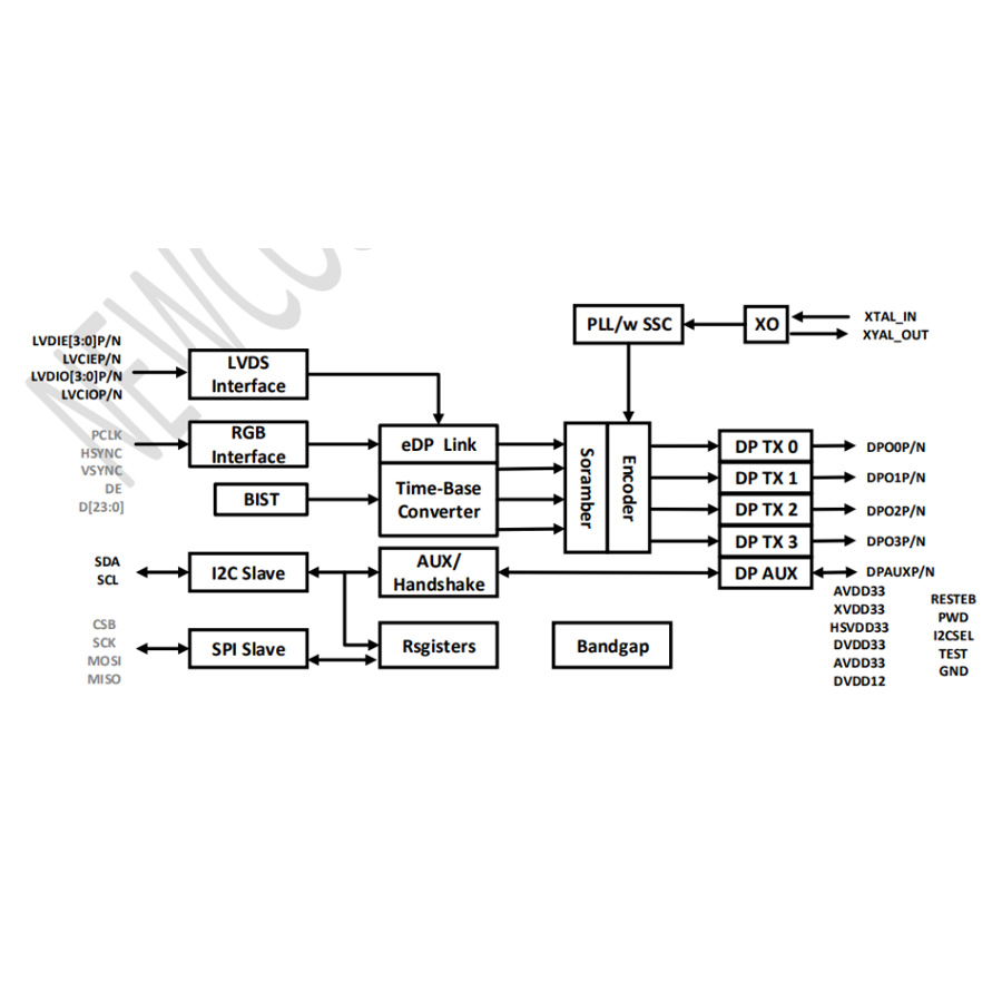 NCS8801S is a low-power RGB/LVDS-to-DisplayPort/eDP converter, which is designed for mobile devices including smartphones, tablets, laptops, etc. to support high-definition DP/eDP displays. NCS8801S supports 4-lane DP/eDP output which is typically required to support QXGA (2048*1536) and above at 60Hz frame rate. All the functions including both RGB and LVDS interfaces pack into a small 7mm*7mm QFN56 package which saves the precious space in mobile devices.
