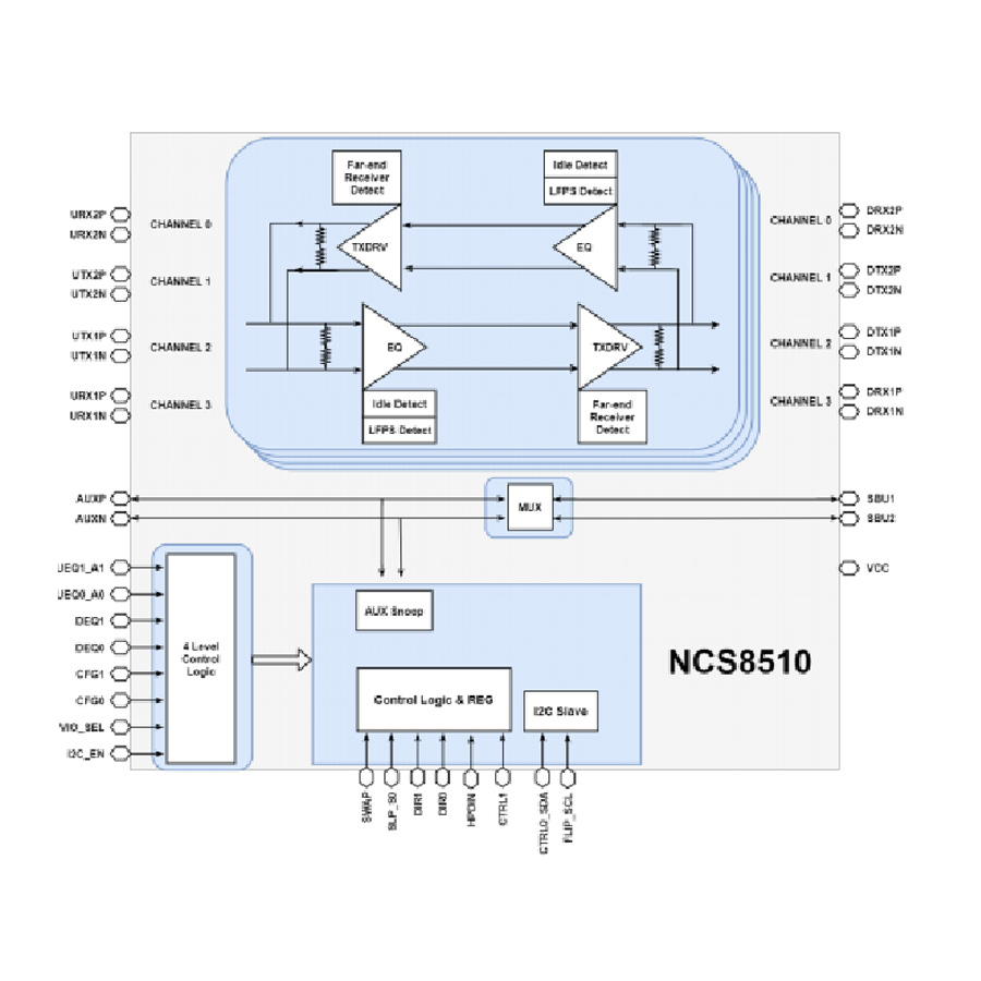 The NCS8510 is a USB Type-C bi-directional linear redriver supporting data rates up to 10 Gbps. This multi_protocal linear redriver is capable of supporting USB type-C with USB 3.1 and DisplayPort 1.4 as alternate mode. It can also be configured to support custom USB Type-C alternate modes. The NCS8510 provides several levels of receive equalization to compensate for cable and board trace loss due to inter-symbol interference (ISI) when USB 3.1 Gen 1/Gen 2 or DisplayPort (or other Alt modes) signals travel across a PCB or cable. This device operates at a single 3.3V power supply and implements advanced power management by monitoring USB power states and snooping DP link training. All four lanes of the device are reversible and each lane has a receiver equalizer with selectable gain settings.